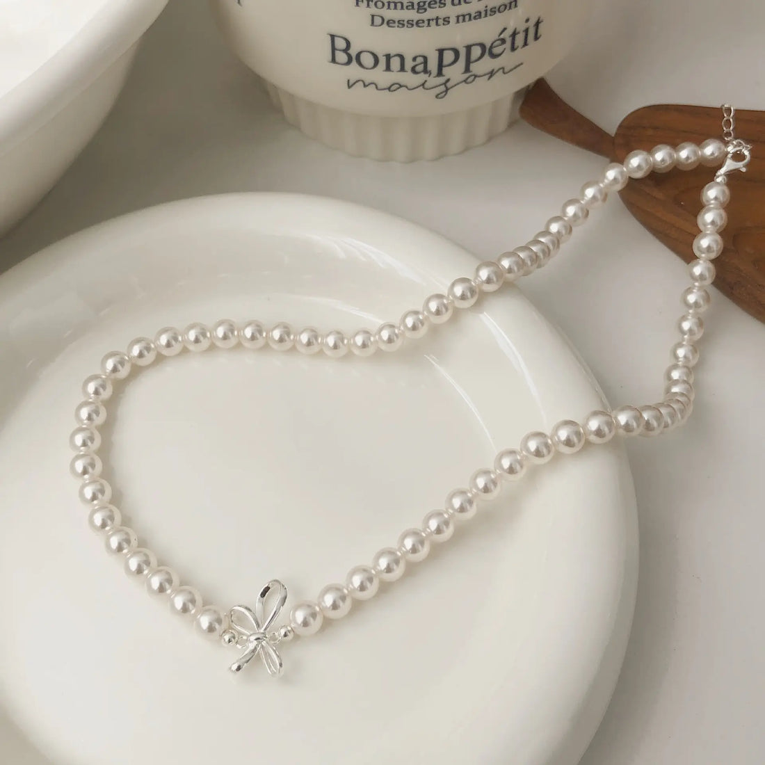 925 Silver Three-Dimensional Bowknot Imitation Pearl Necklace
