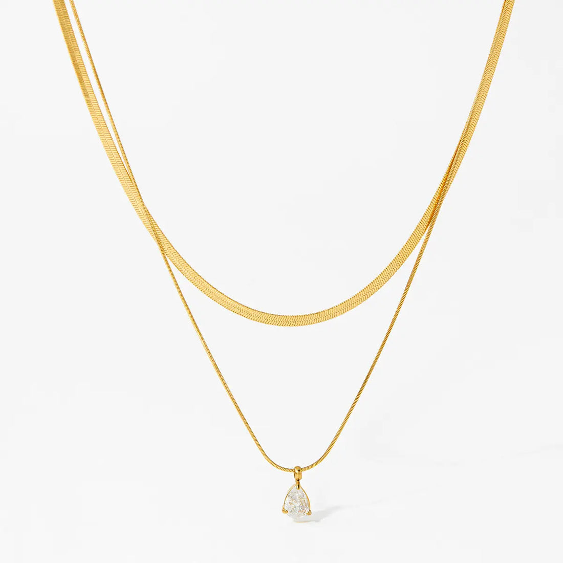 Stainless Steel Double-Layer Necklace with Teardrop Cubic Zirconia Pendant