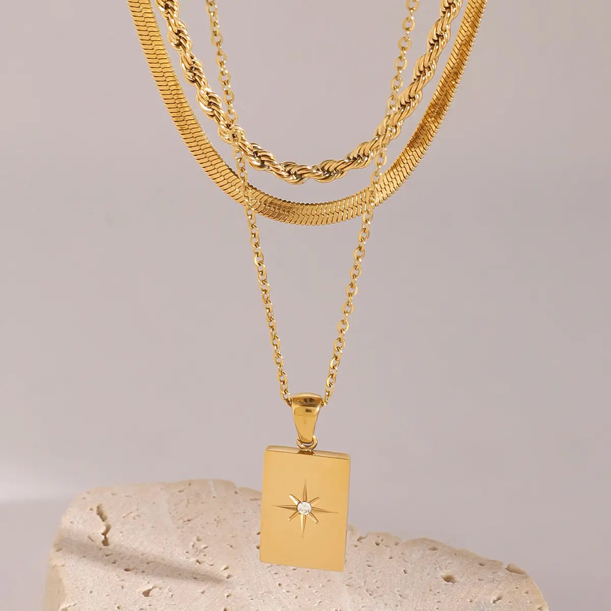 Stainless Steel Triple-Layer Star & Square Hollow Pendant Necklace