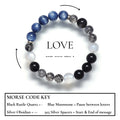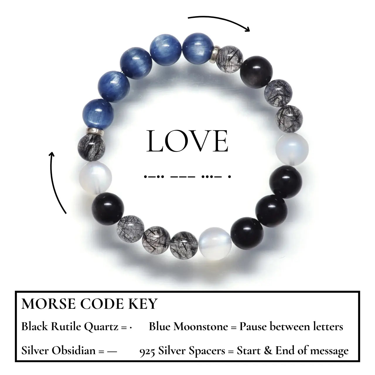 Each Morse code couple bracelet spells out “LOVE” (.-..□---□...□.) using natural crystals and meaningful design.