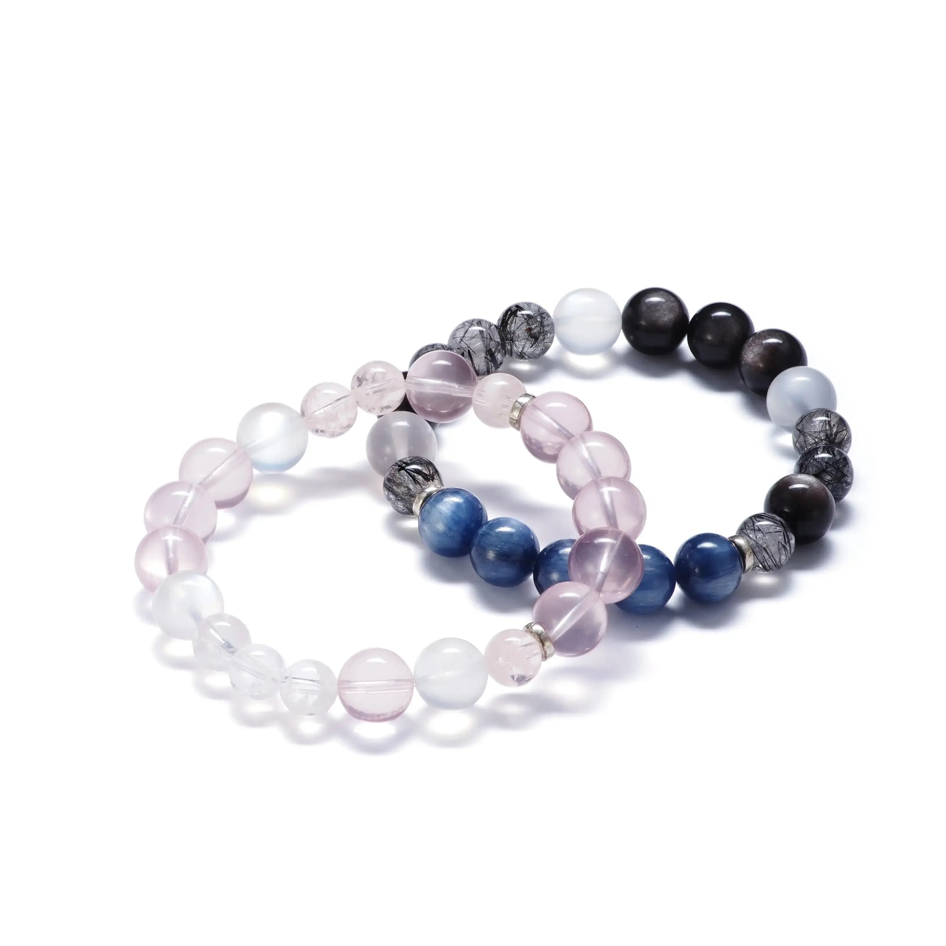 The alternating crystals create a rhythm of love, protection, and communication, while the shared Blue Moonstone spacers reflect emotional clarity and sincerity between partners.