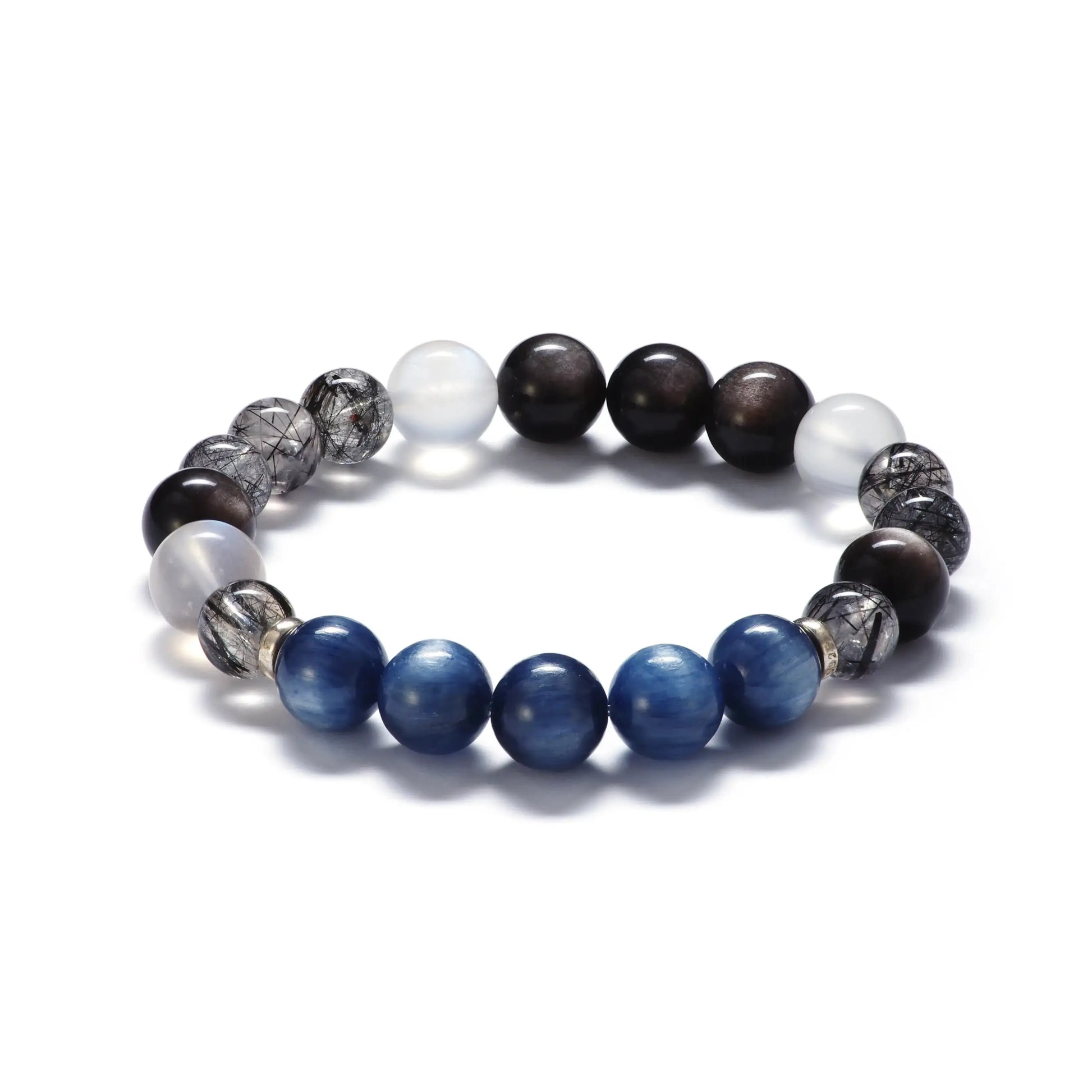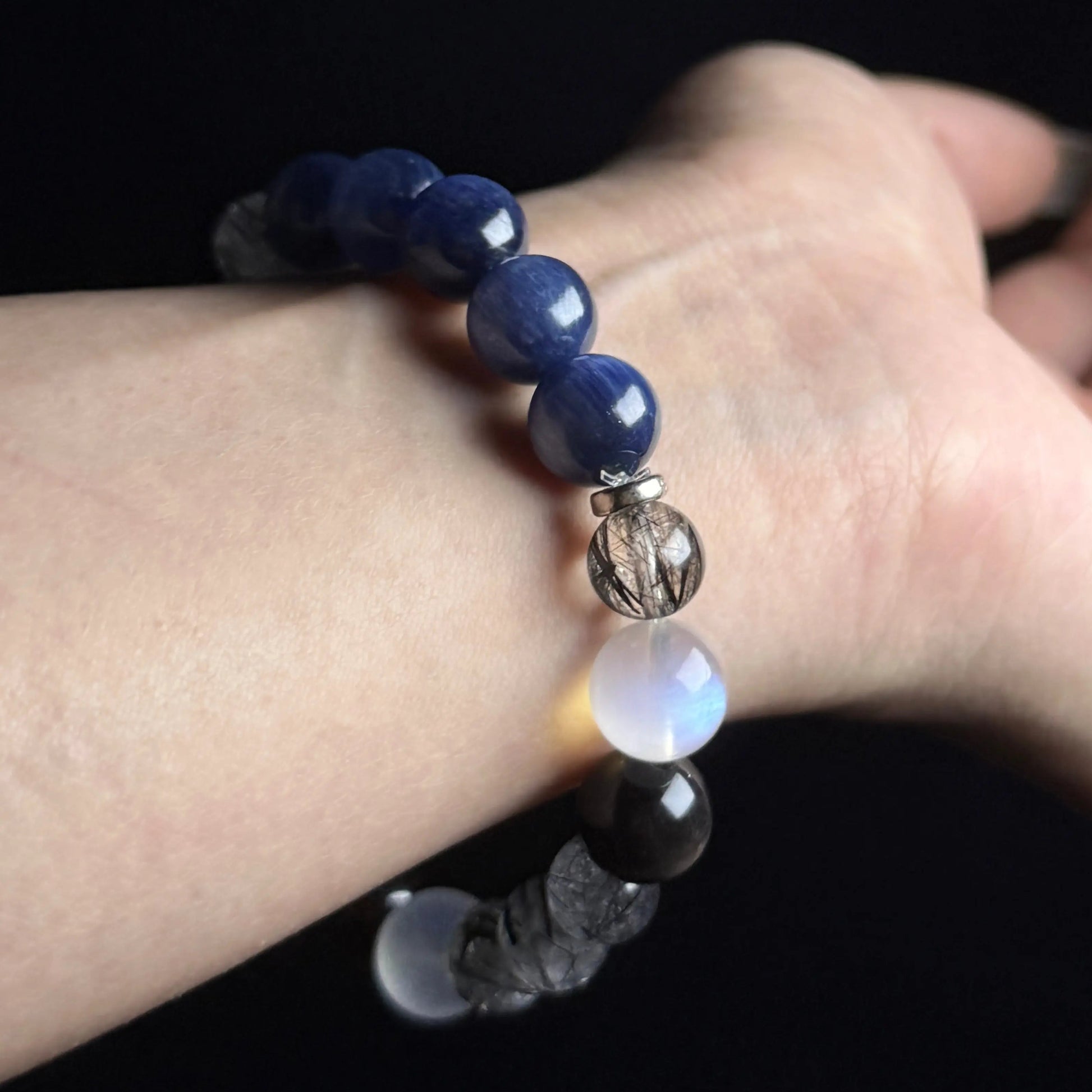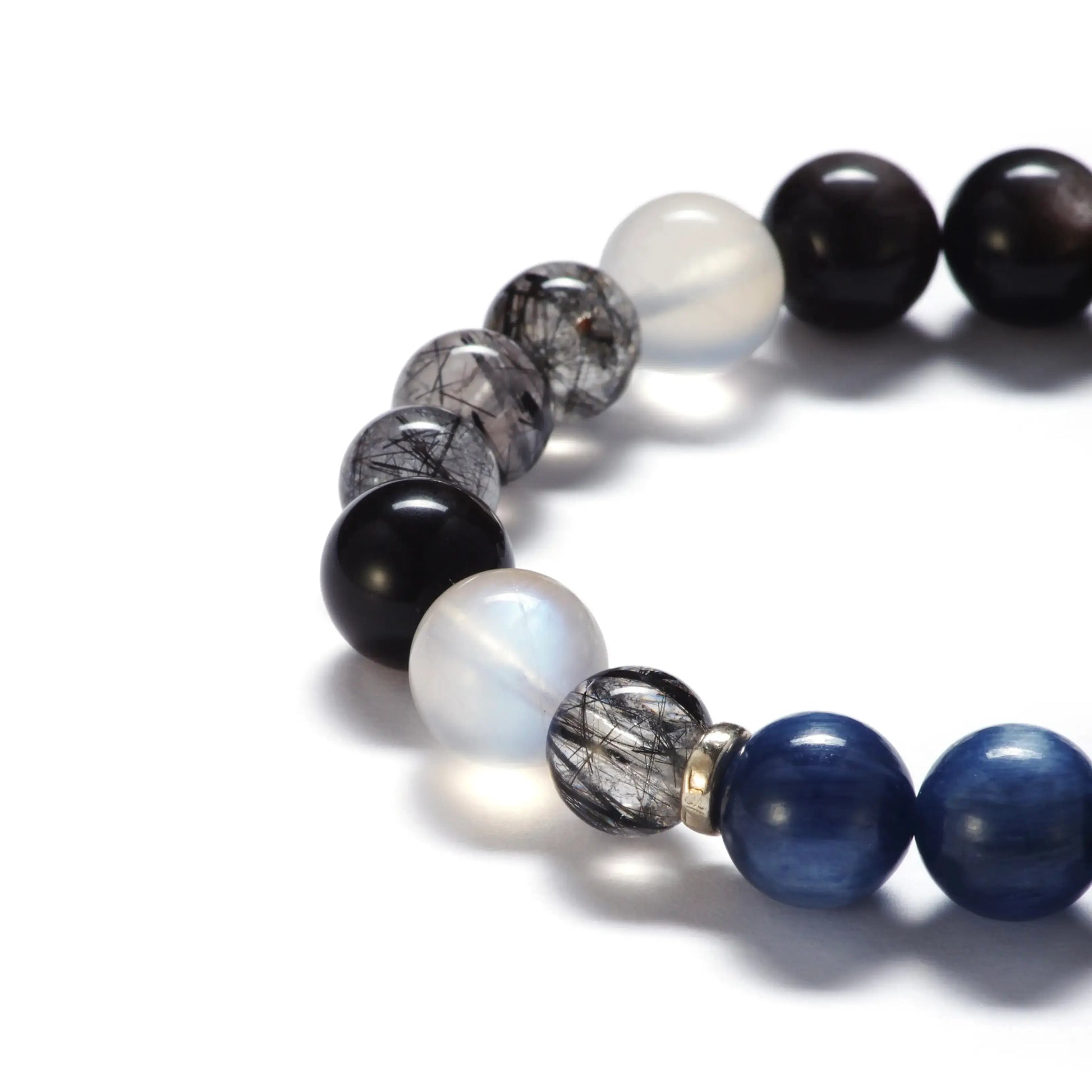The mix of obsidian and rutile quartz reflects grounded love and energetic protection, while blue moonstone enhances communication and emotional flow.