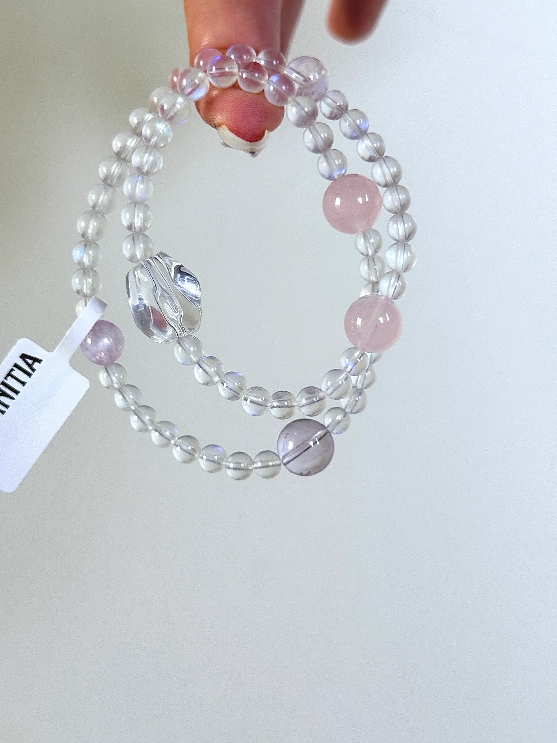 The Inner Light Healing Crystal Bracelet is a calming energy bracelet designed to nurture your heart and reconnect you to your inner peace. With pastel-toned healing stones like Blue Moonstone, Rose Quartz, Amethyst, and Lepidolite, it creates a gentle yet powerful vibration that supports emotional healing, self-love, and spiritual clarity.