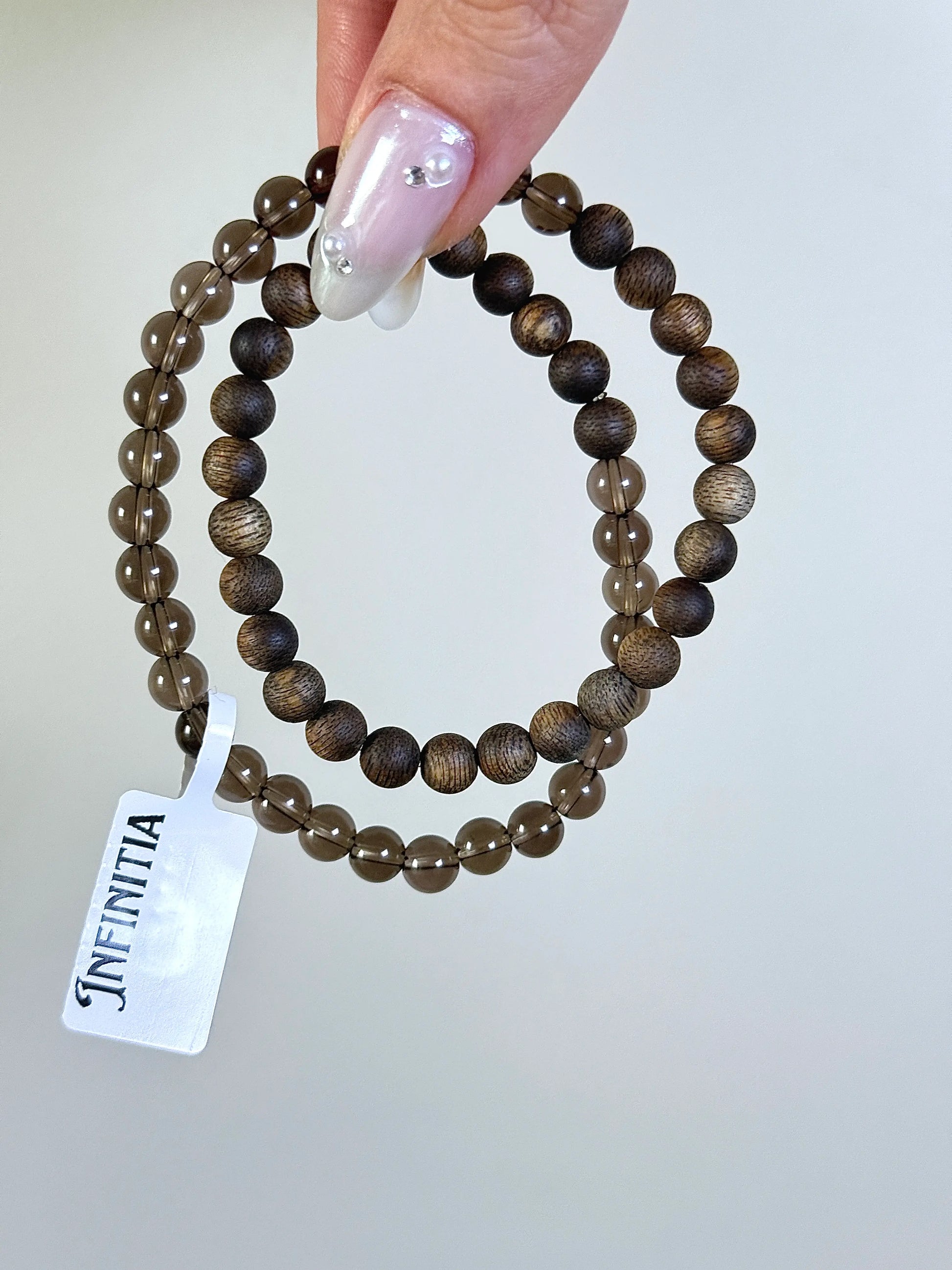 This bracelet pairs the protective energy of Smoky Quartz with the rare, deeply aromatic beauty of Agarwood. The 6mm smoky quartz beads balance emotions and ground the wearer, while 6mm agarwood beads release their rich, natural fragrance — a signature of ancient luxury and spiritual refinement.