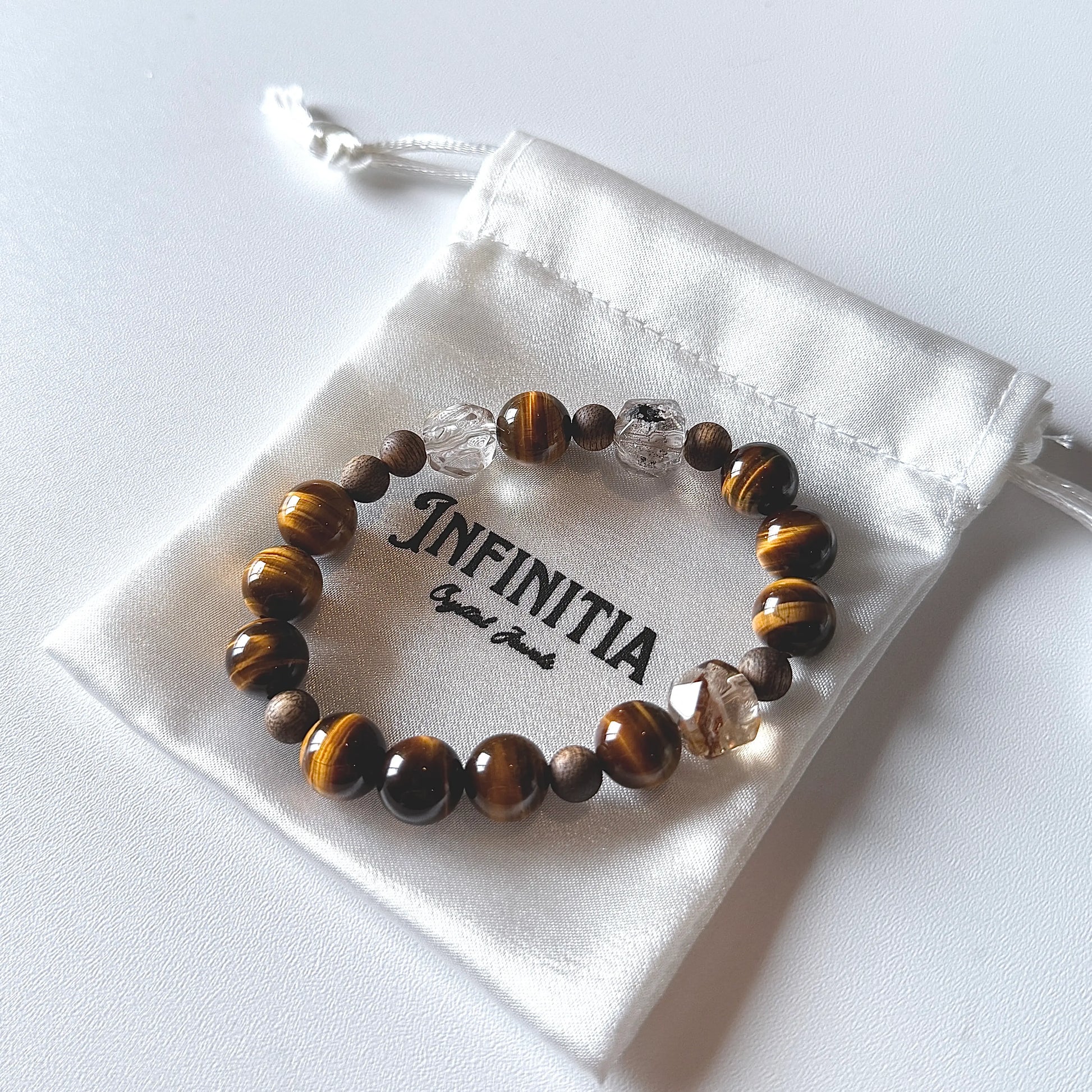 Strengthen courage and mental clarity with this unique combination of Golden Tiger’s Eye (10mm), Herkimer Diamond Quartz, and Agarwood (6mm) beads. This design fuses confidence, wisdom, and grounding energy in one powerful piece.